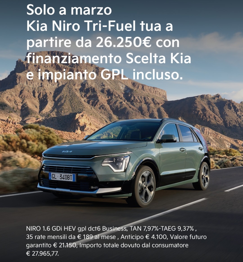 Kia Niro TRI-FUEL (Full Hybrid-benzina/GPL) – Vantaggio Totale Cliente fino a € 5.850 – rata da € 209/mese (Scelta Kia TAN 7,95%)